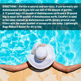 DIRECTIONS – Perlite is natural and non-toxic. If you normally use diatomaceous earth you will use half of the amount of perlite. A 12 pound bag = 24 pounds of diatomaceous earth and a 25 pound bag is equal to 50 pounds of diatomaceous earth. CelaPerl is used in the same manner as diatomaceous earth. Simply precoat your filters with the same number of scoops you use today. Lightweight Bags Makes it Easier for All to Use. The difference is clear. Our customers tell us every day – There's no substitute for CelaPerl perlite when it comes to filter aids for swimming pool filters. For over 50 years, EP Minerals' EP Minerals perlite have the chemical characteristics that make our products the perfect filter aid for the swimming pool and spa industry. CelaPerl is a lightweight perlite filter media for swimming pools and spas. Perlite originates from naturally occurring volcanic rock containing water. When heated, the perlite expands to 20 times its original volume and becomes an excellent filter media. New low dust formulation - #1 choice of pool pros- No leaky bags and no mess - Thermally sealed poly bag - Patent-pending. Removes Particles Down to 4.0 Microns providing a cleaner pool. CelaPerl is non-toxic and environmentally friendly, providing good pool clarity and improved oil absorption.